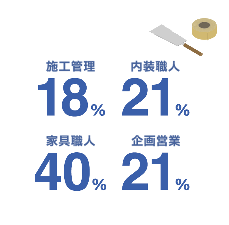 企画から施工まで一気通貫で内装工事を担う弊社には多くの職種が存在します。それぞれが自分の得意分野を活かしながら仕事に取り組んでいます。